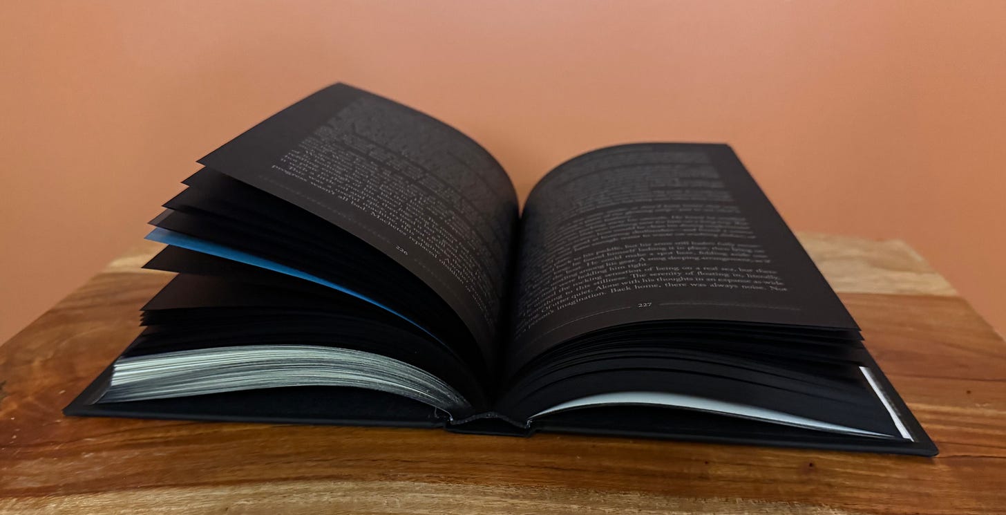 The text on the page is a metallic silver, reflecting brightly off the dark paper. You aren’t just curious about the protagonist’s first steps of his journey, you are now experiencing the darkness and uncertainty alongside him as you read.